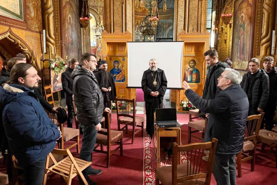 În continuare, domnul arhitect dr. Ioan Sasu a prezentat imagini documentare privind restaurările efectuate atât în perioada lui Lecomte de Noüy, cât și după anii 1990, subliniind importanța implicării viitorilor slujitori în conservarea patrimoniului bisericesc – o misiune de durată, dar cu ecouri peste veacuri, ca mărturie a credinței ortodoxe.